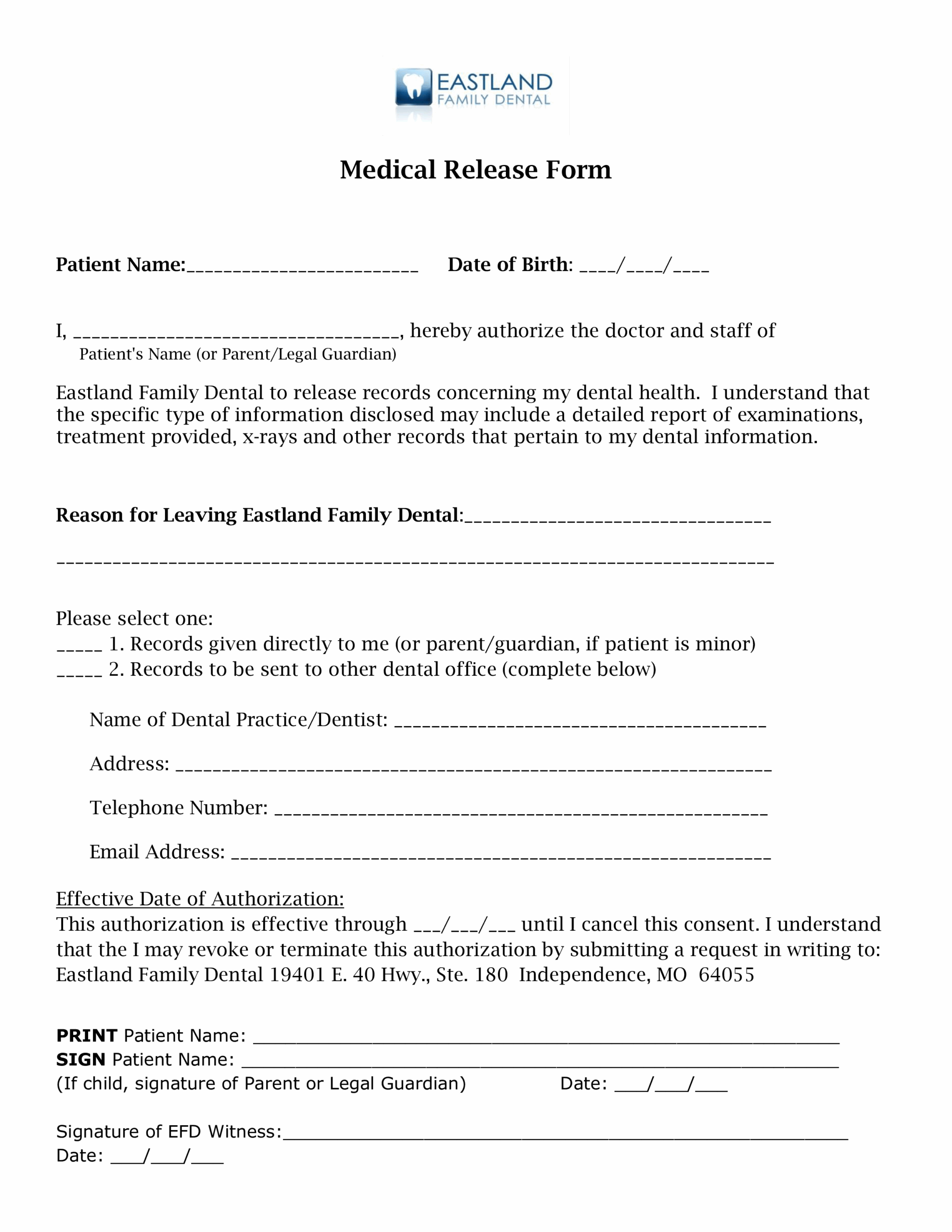 Printable Dental X-Ray Release Form