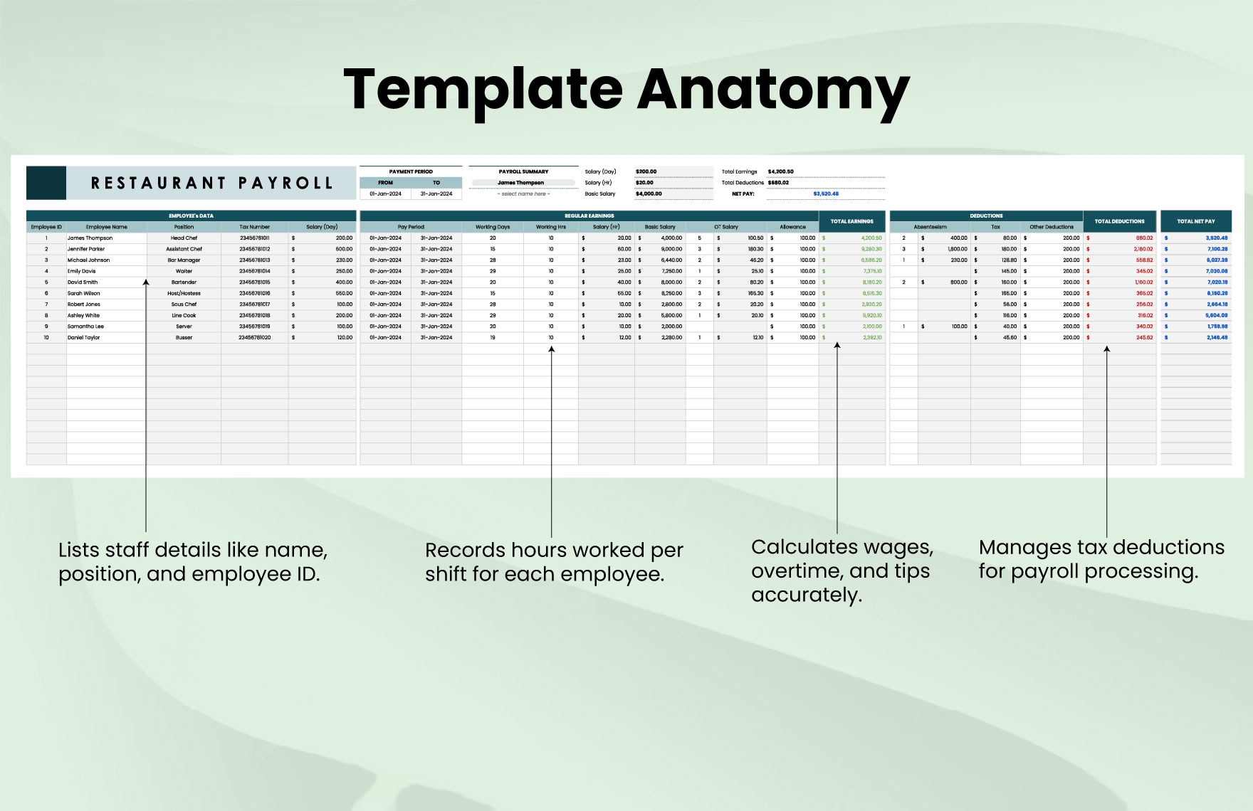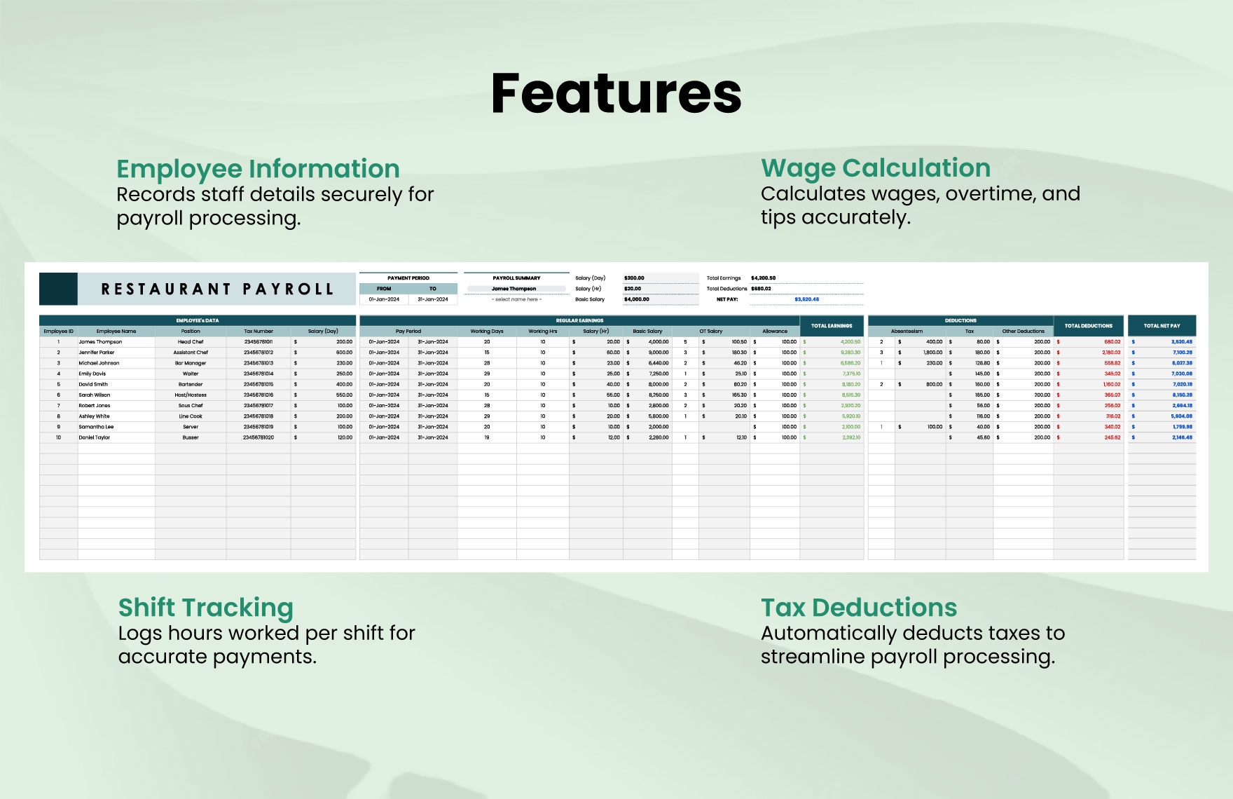 With a printable weekly restaurant payroll template, restaurant owners can easily input employee information such as names, hours worked, hourly rates, and any additional earnings or deductions. This template allows for customization based on the specific needs of the restaurant, ensuring that payroll calculations are accurate and compliant with labor laws.